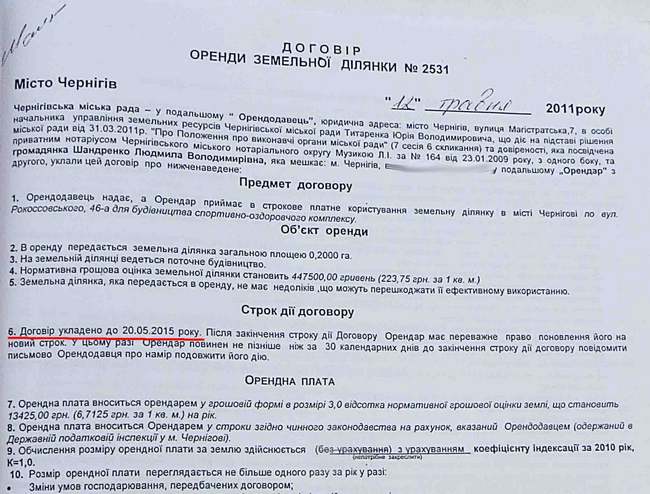 Водночас, згідно документів, які оприлюднив журналіст інтернет-видання «Город» Ігор Грищенко, Юрій Тарасовець – лише підрядник, який надає будівельні послуги. Так, 12 травня 2011 року цю земельну ділянку Чернігівська міська влада, в особі начальника управління земельних ресурсів Юрія Титаренка, передала громадянці Людмилі Шандренко, помічниці колишнього народного депутата Валерія Дубіля. В предметі договору вказано, що ділянка передавалася для будівництва спортивно-оздоровчого комплексу.