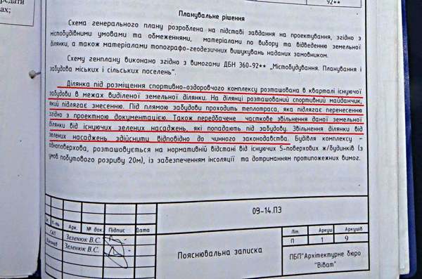 Але справа навіть не в цьому. З документації випливає, що дана земельна ділянка не є вільною від забудови територією. На території земельної ділянки розташована спортивна площадка, яка підлягає знесенню. Крім того, потрібно перенесення теплотрас та знесення зелених насаджень. Що ж стосується спортивного майданчика, то мешканці мікрорайону стверджують, що ЖЕК-10 під керівництвом Володимира Кривенка вже давно займався її поступовим зносом.