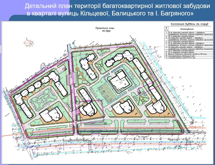 - проект містобудівної документації «Детальний план території багатоквартирної житлової забудови в кварталі вулиць Кільцевої, Балицького та І. Багряного»;